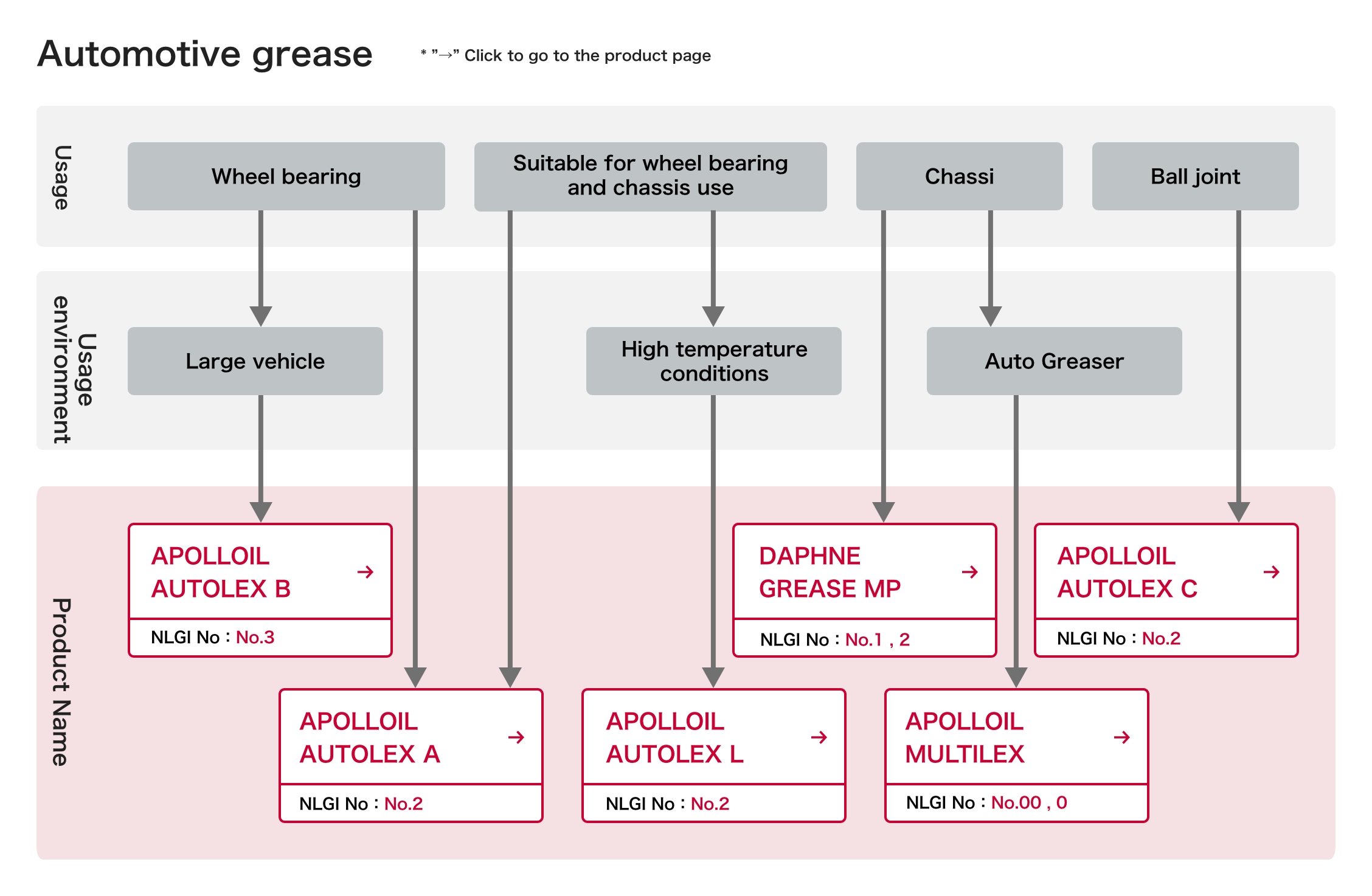 | Apolloil Autolex B | Wheel bearing grease for large vehicles such as trucks and various industrial machines. | NLGI No.3 |