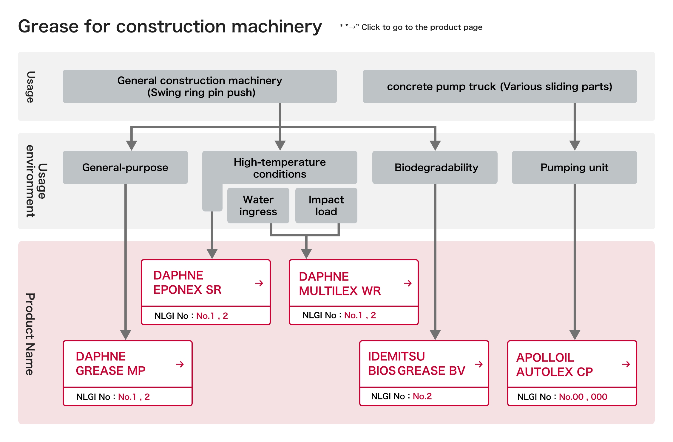 | Daphne Grease MP | Lithium grease for vehicles that is suitable for various parts of automobile chassis. | NLGI No.1,2 |
