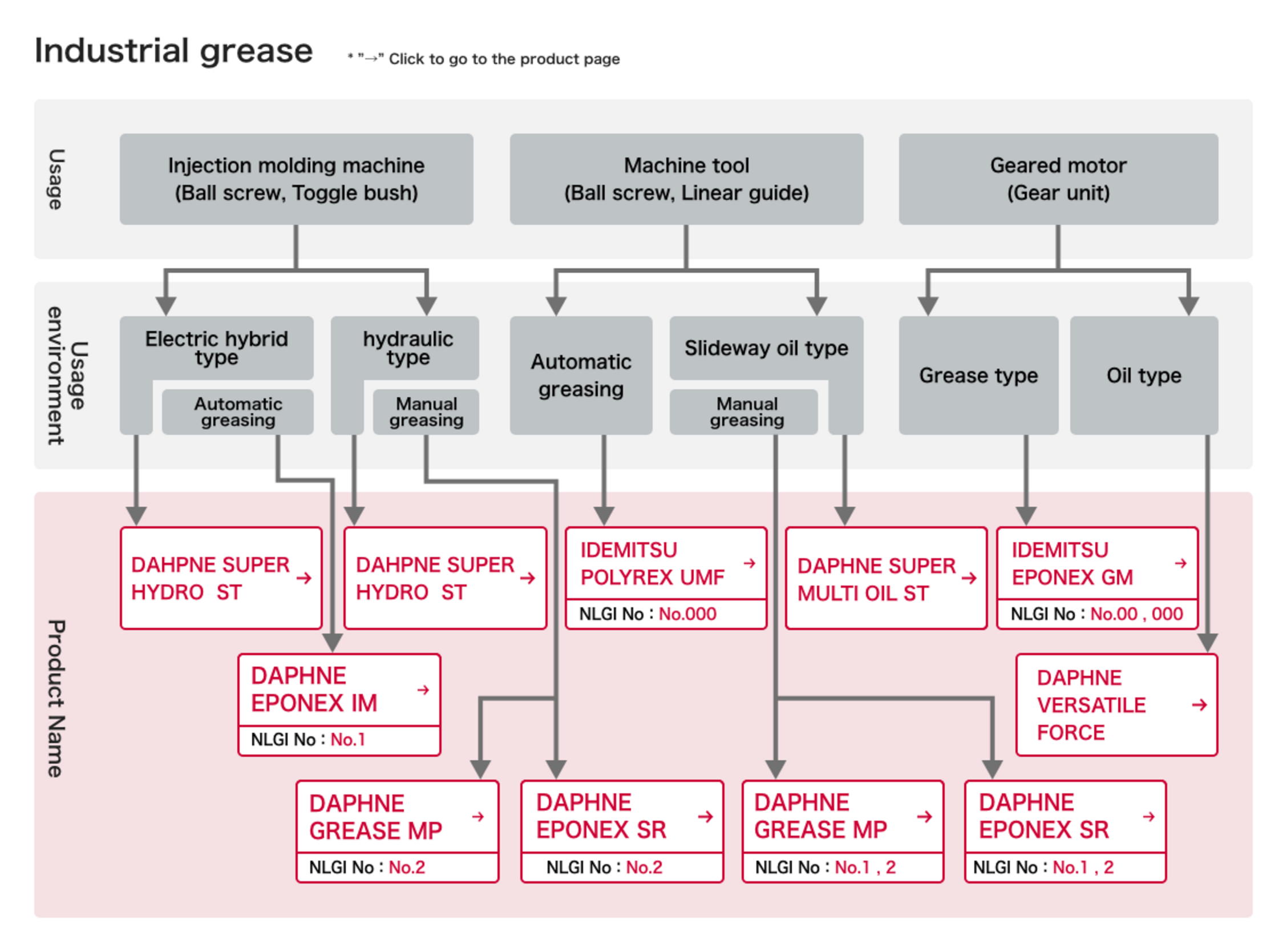 | Daphne Grease MP | A multi-purpose lithium EP grease with excellent water resistance, heat resistance and shear stability. | NLGI No.0,1,2,3 |