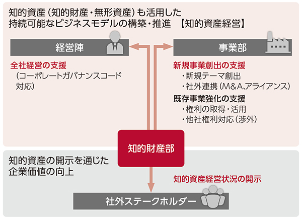 具体的には、事業企画段階などの初期段階から、IPランドスケープ手法による内外環境分析を行い、知的財産情報を事業部門関係者や研究者に提供することで既存事業の強化すべき点の把握や新規事業の方向性検討を行い、事業ポートフォリオの転換を促進しています。